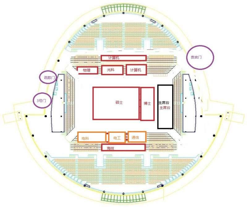 (1)12:40参会毕业生按班级组队(北区操场),统一由体育馆3号门(1楼)入场,并按照分配区域(附件1)就坐;