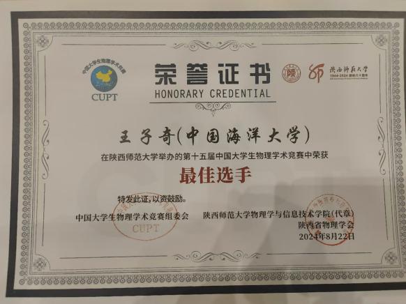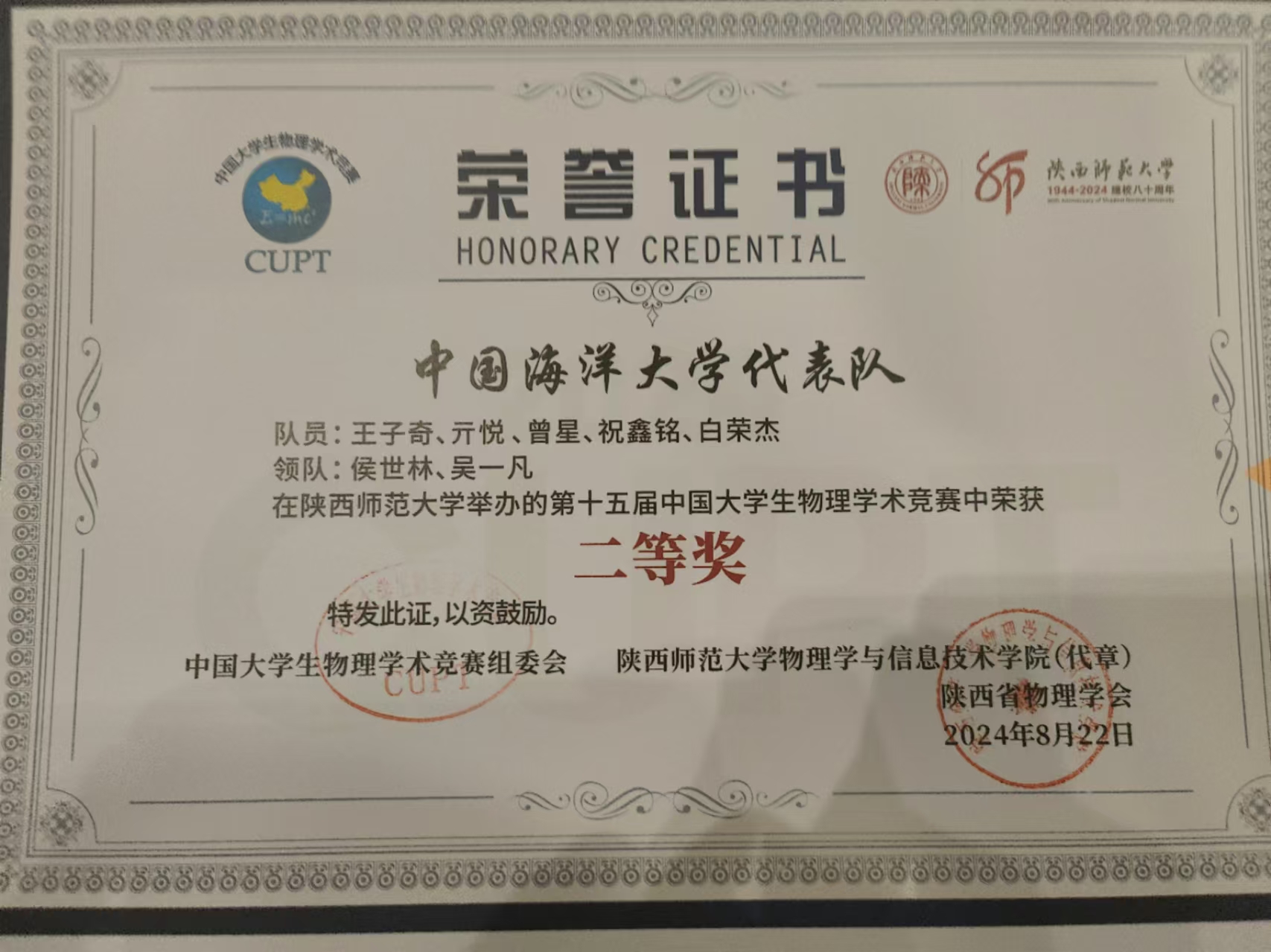 8月22日,第十五届中国大学生物理学术竞赛(CUPT)在陕西师范大学落下帷幕。91视频 代表队经过三天5轮15场的激烈角逐,勇夺国赛二等奖,获得明年国赛直通名额。91视频 代表队队长2022级物理学专业王子奇发挥稳健出色,以优异的成绩夺得国赛“最佳选手”个人奖项。