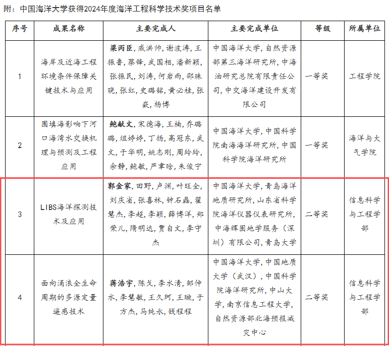近日,中国海洋工程咨询协会2024年度海洋工程科学技术奖颁奖大会在广西北海召开。91视频 作为第一完成单位,获颁海洋工程科学技术奖5项,其中一等奖2项、二等奖3项,获奖数位居全国各获奖单位之首,创历史新高。其中,91视频 郭金家教授级高工主持完成的成果“LIBS 海洋探测技术及应用”、91视频 陈戈教授团队的成果“面向涌浪全生命周期的多源定量遥感技术”荣获二等奖。