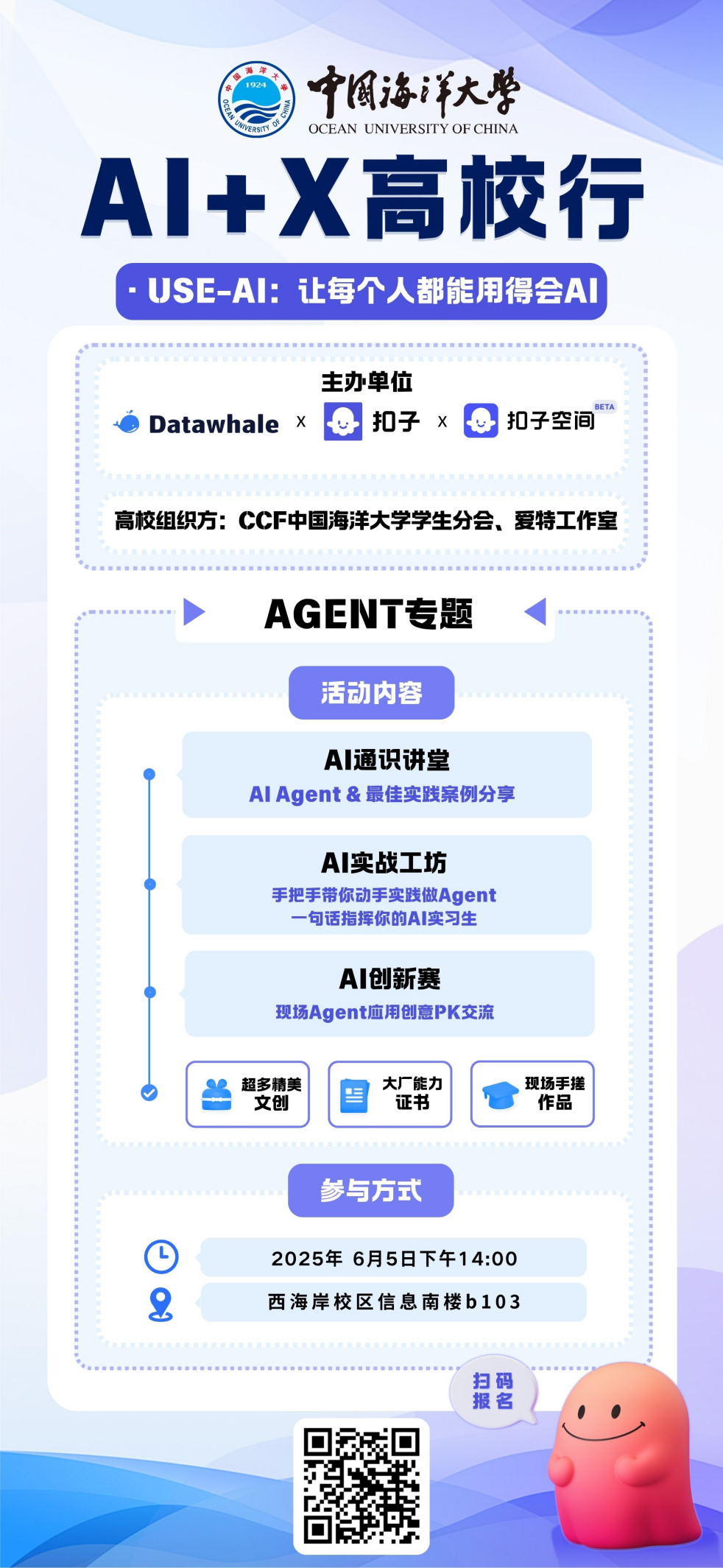 在人工智能飞速发展的今天,AI Agent正在成为推动行业变革的关键力量。为了助力同学们提升AI技术能力,紧跟前沿技术趋势,CCF91视频 学生分会、爱特工作室携手Datawhale开源学习社区,将于2025年6月5日下午14:00在西海岸校区信息南楼b103启动“AI+X高校行Agent专题”活动。一场知识与实践的盛宴,一次创新思维的碰撞,一次探索AI无限可能的奇妙之旅,等你来赴约!