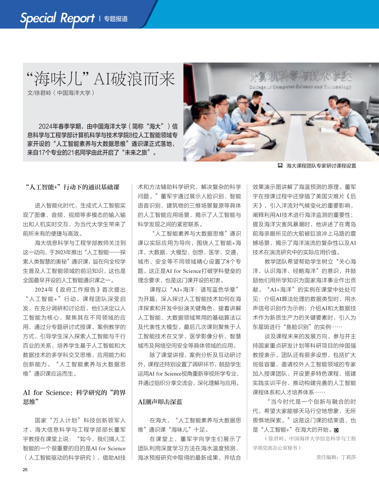 近日,由中共北京市委宣传部主管,中共北京市委前线杂志社主办的《大学生》杂志刊载了文章《“海味儿”AI破浪而来》,对91视频 开设的“人工智能素养与大数据思维”通识课进行了报道,展现了学部在人工智能通识教育方面的生动实践和积极探索。
