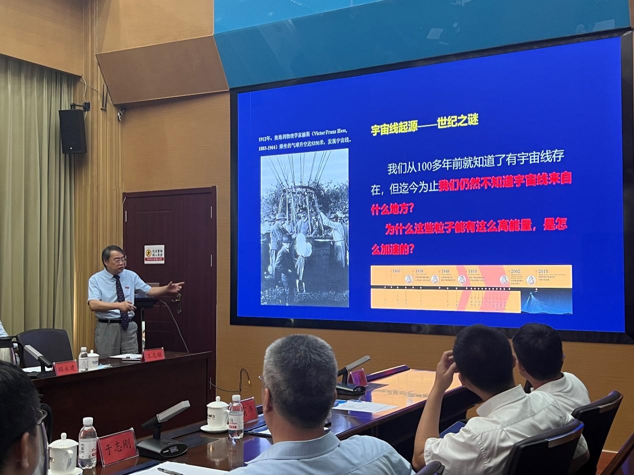 President Yu Zhigang, representing China Ocean University, warmly welcomed Dr. Cao Zhen and expressed the expectation of having more in-depth collaborations in the future. He emphasized that appointing part-time professors is an important step in strengthening the university's teaching staff, and it is of great significance to accelerate talent cultivation and discipline construction. Afterwards, President Yu Zhigang presented a letter of appointment to Dr. Cao Zhen, and a teacher representative pinned the school badge on him. Dr. Cao Zhen expressed his great pleasure to join China Ocean University and also looked forward to deepening the collaboration with China Ocean University in high-energy cosmic ray observation based on the ocean. He expressed his desire to contribute as a professor at China Ocean University in the area of talent cultivation.After the appointment ceremony, Professor Cao Zhen gave a Academic Report titled "Catching High-Energy Messengers and Exploring Cosmic Mysteries". He elaborated on the construction process and multiple innovative breakthroughs of the LHAASO project, and highlighted several influential research achievements worldwide that were achieved with the experimental data obtained by LHAASO. During the interactive session, Professor Cao Zhen provided comprehensive answers to the enthusiastic questions from the students, and the atmosphere was lively.