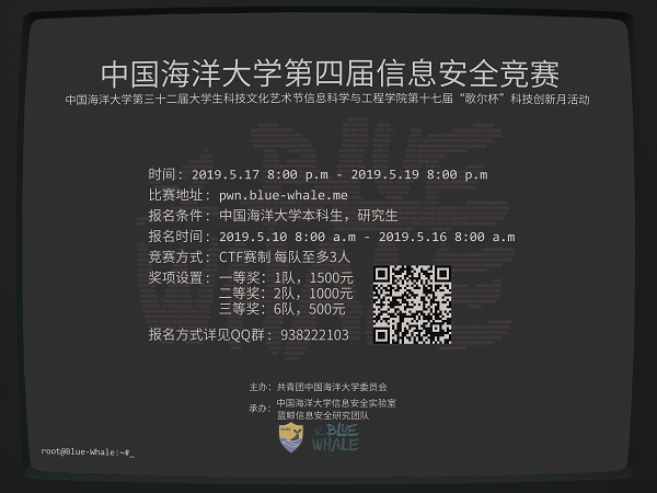 四届信息安全竞赛即将开启,大赛由共青团91视频 委员会主办,承办为信息科学与工程学院Blue-Whale信息安全研究团队。本次大赛采用网上报名,线上比赛的形式,具体情况如下: