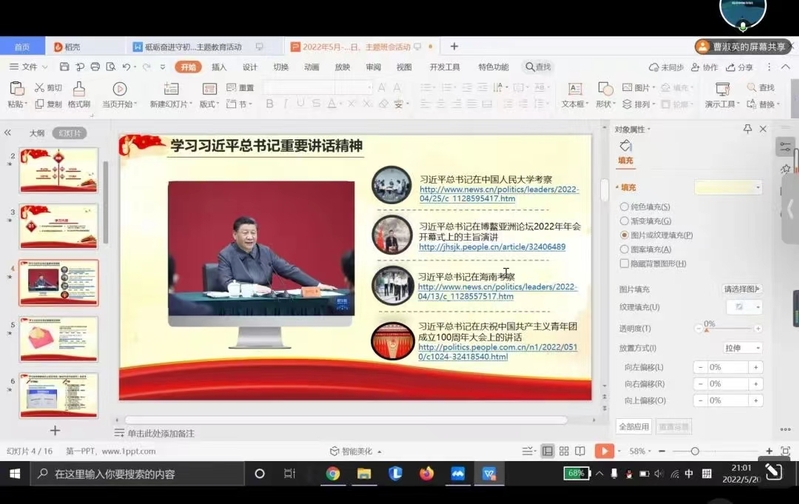 5月19日,2021级计算机硕士4班团支部采用在线上分享榜样故事、学习榜样纪录片的形式开展主题团日活动。支部成员分享了身边的榜样,如学习成绩优异又热心为他人答疑解惑的同学、核酸检测积极服务师生的防疫人员等。随后团支书带领同学们学习党团史中英勇奋斗、乐于奉献的英雄楷模人物事迹,呼吁同学们向榜样看齐,积极践行全心全意为人民服务的宗旨,强化责任担当意识,树立为中华民族伟大复兴的中国梦而不懈奋斗的远大理想。