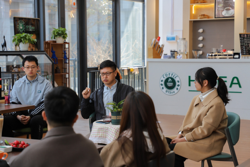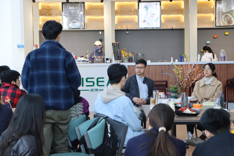 阳光和煦,咖啡飘香,活动现场气氛轻松融洽。董军宇部长分享了计算机科学与技术学院本科各专业的发展历史和人才培养目标,勉励同学们要主动顺应时代需求,结合自身专业建功立业。董军宇部长介绍了自己的研究方向、实验室情况和目前取得的成果,引起了同学们的浓厚兴趣,同学们纷纷表达了强烈的参与科研训练的意愿。随后,董军宇部长从自己在赫瑞瓦特大学攻读博士学位的经历和感受引入,为同学们分享了国外留学经验。