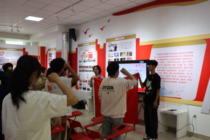2023级海洋技术1班曾天朗带领新团员宣誓,“我志愿加入中国共产主义青年团,坚决拥护中国共产党的领导,遵守团的章程,执行团的决议,履行团员义务,严守团的纪律,勤奋学习,积极工作,吃苦在前,享受在后,为共产主义事业而奋斗。”